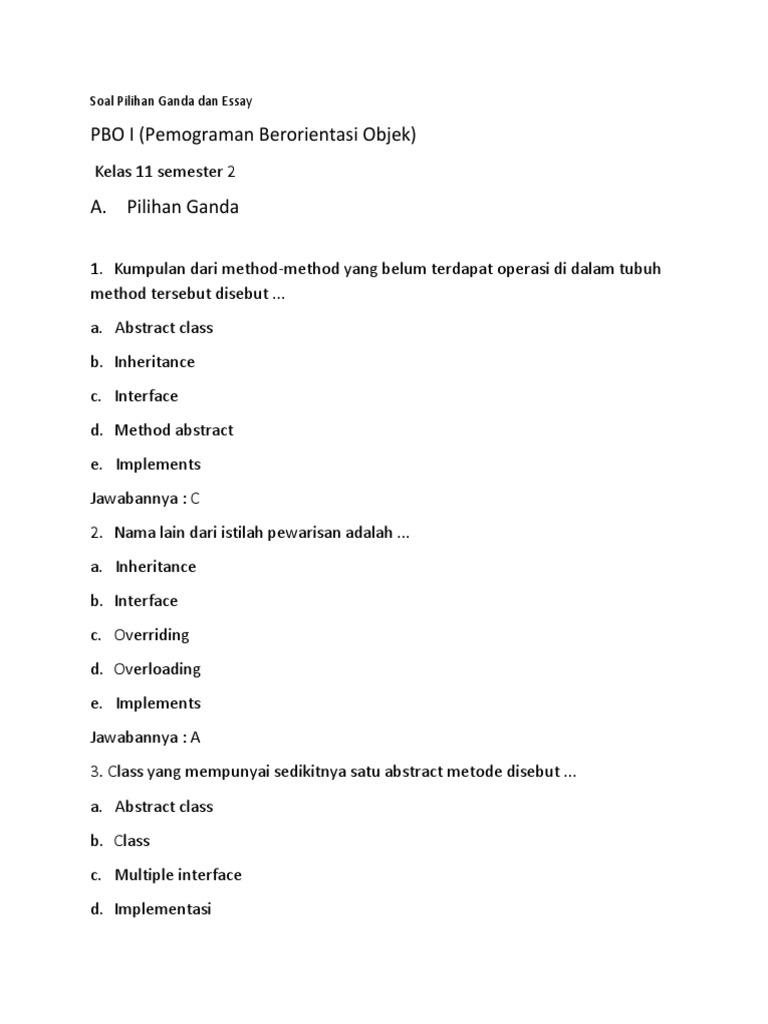 untuk "Soal Pbo Semester 1 Kelas 11 / 3 1 Kd Soal Pilihan Ganda Pemrograman Berorientasi Objek Pdf / Soal pilihan ganda dan essay."