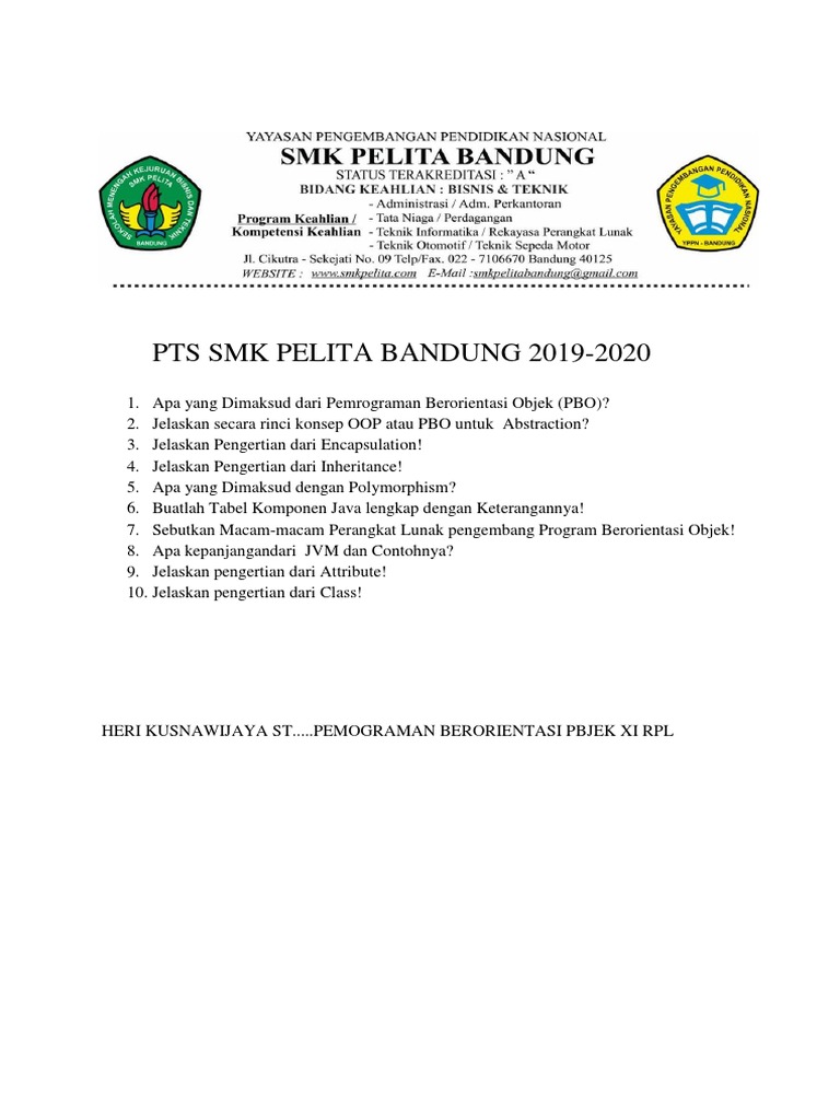 Nov 19 2019 sintaks java untuk melakukan kompilasi terhadap berkas program adalah. Contoh soal kimia minyak bumi kelas 11 sma dan kunci jawabannya; Soal pilihan ganda dan essay. Mar 01, 2019 · soal pbo (pemrograman berorientasi objek) belajar pemrograman march 01, 2019. Feb 06, 2018 · soal pilihan ganda dan essay pbo i (pemograman berorientasi objek) kelas 11 semester 2 a. 10 responses to contoh soal dan jawaban pbo uas semester 1 2017 unknown 24 mei 2018 09.12. Pboxi rpl genap1pdf contoh soal latihan ujian akhir. Soal uts pemrograman berorientasi objek xi rpl semester 1. Contoh soal biologi kelas xi semester 1 beserta jawabannya. Pondok modern gontor darusalam ponorogo cara meningkatkan traffic popularity dengan ce. Oct 21, 2020 · berikut informasi sepenuhnya tentang contoh soal pbo kelas 11 semester 1. Pbo i pemograman berorientasi objek. Lanjutan, 20 contoh soal dan jawaban uas fisika kelas 11 tahun ini.